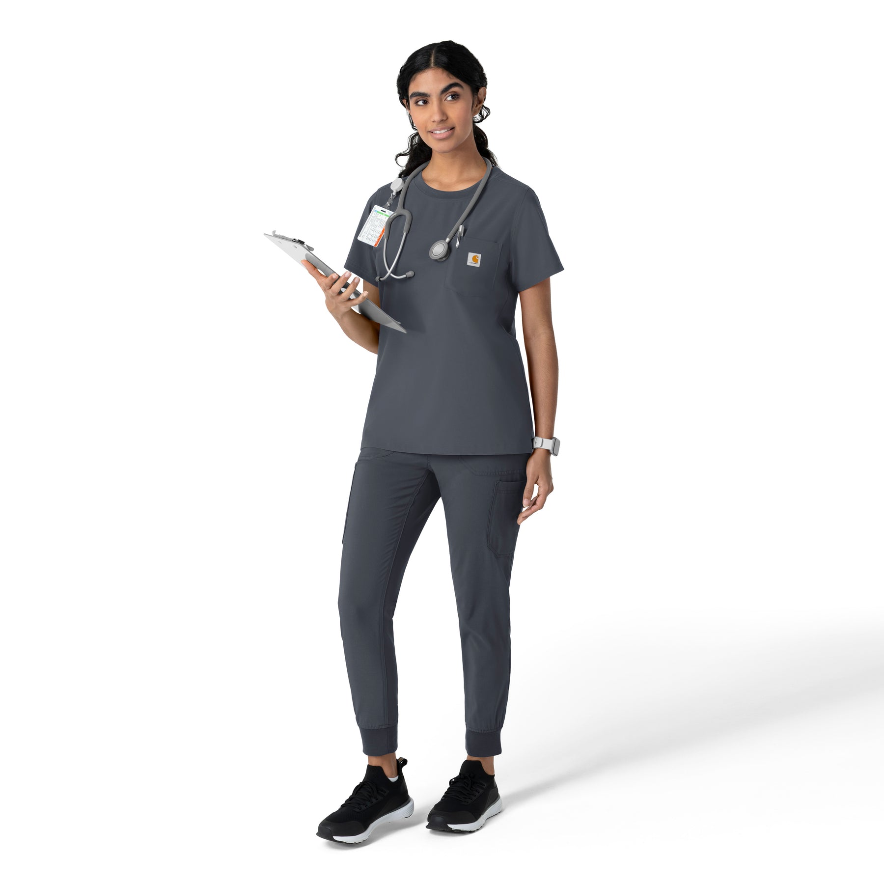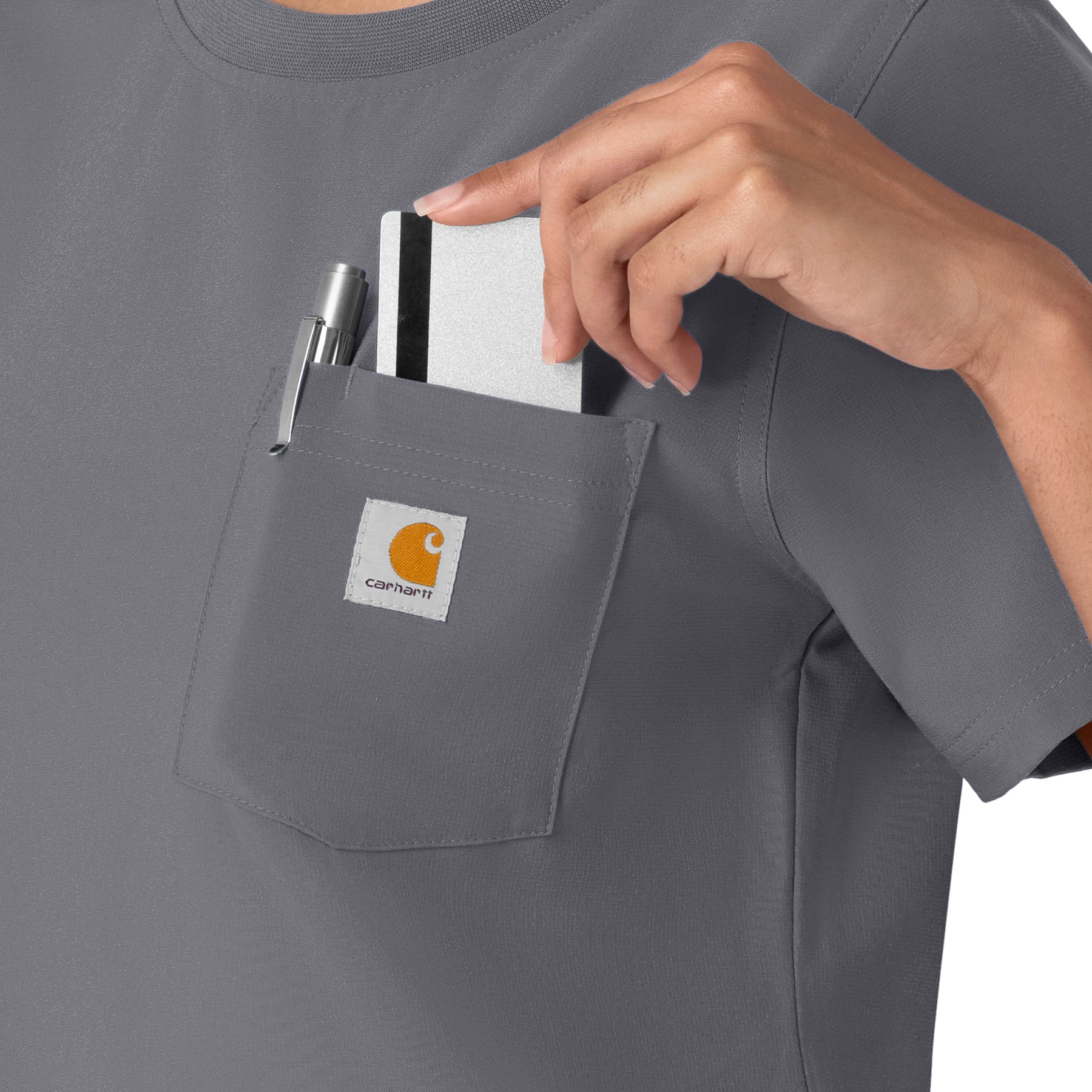 This women's Carhartt scrub top is the perfect blend of everyday comfort and rugged durability, designed to tackle the challenges of long, demanding shifts. It's crafted from a durable stretch polyester fabric that moves with you, providing the flexibility needed for dynamic work environments. The material is built to withstand the wear and tear of a busy workday, ensuring longevity and consistent performance. While it maintains the casual appearance of a classic t-shirt, this scrub top is packed with functional features. A secure zip pocket adds an extra layer of security for valuables. The integrated shoulder badge loop ensures your ID is always visible and readily accessible, streamlining identification procedures. This top is designed to keep you comfortable and organized throughout your shift.