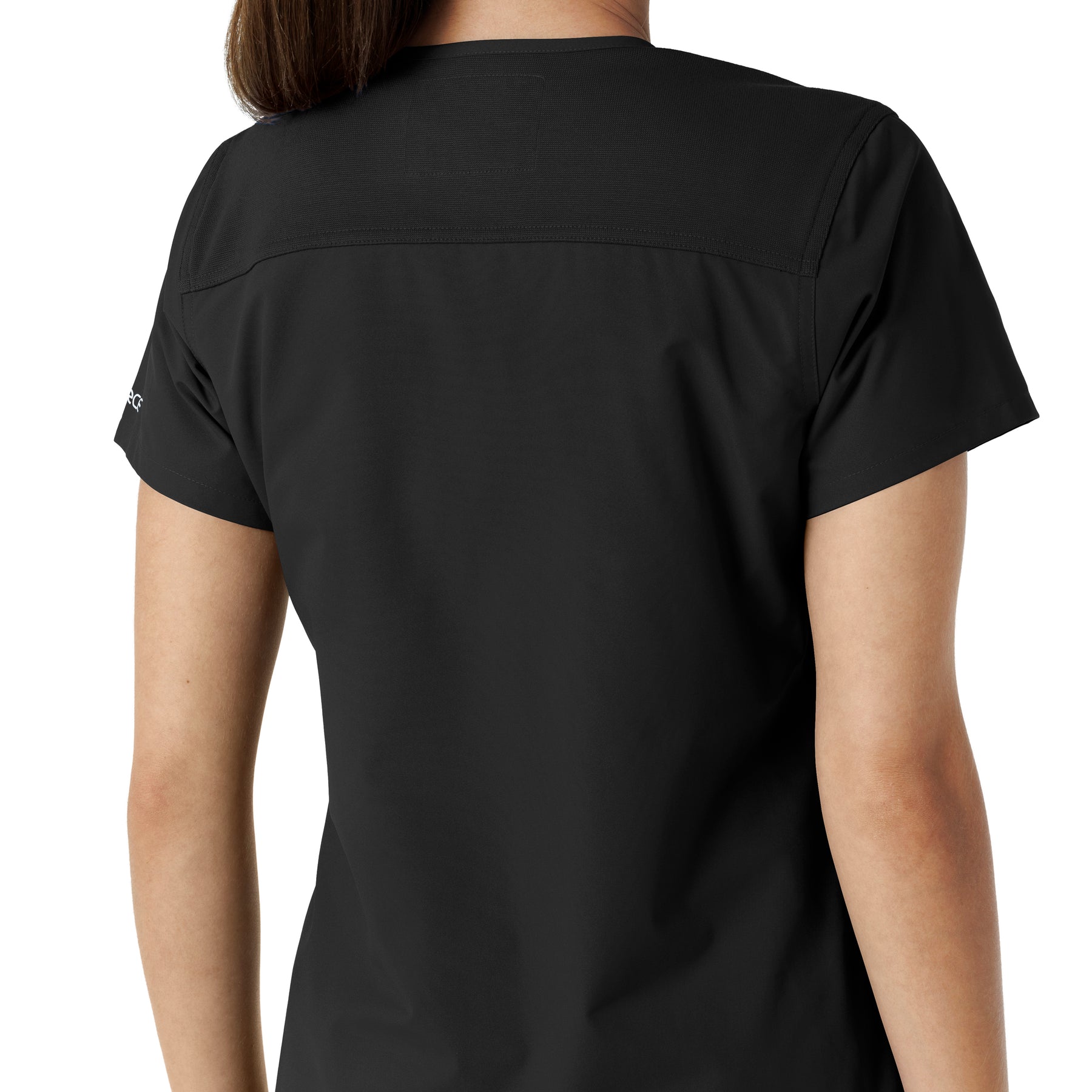• Feature 1: 3/4" V-Neckline for more feminine look with corded matching badge ID loop at shoulder seam