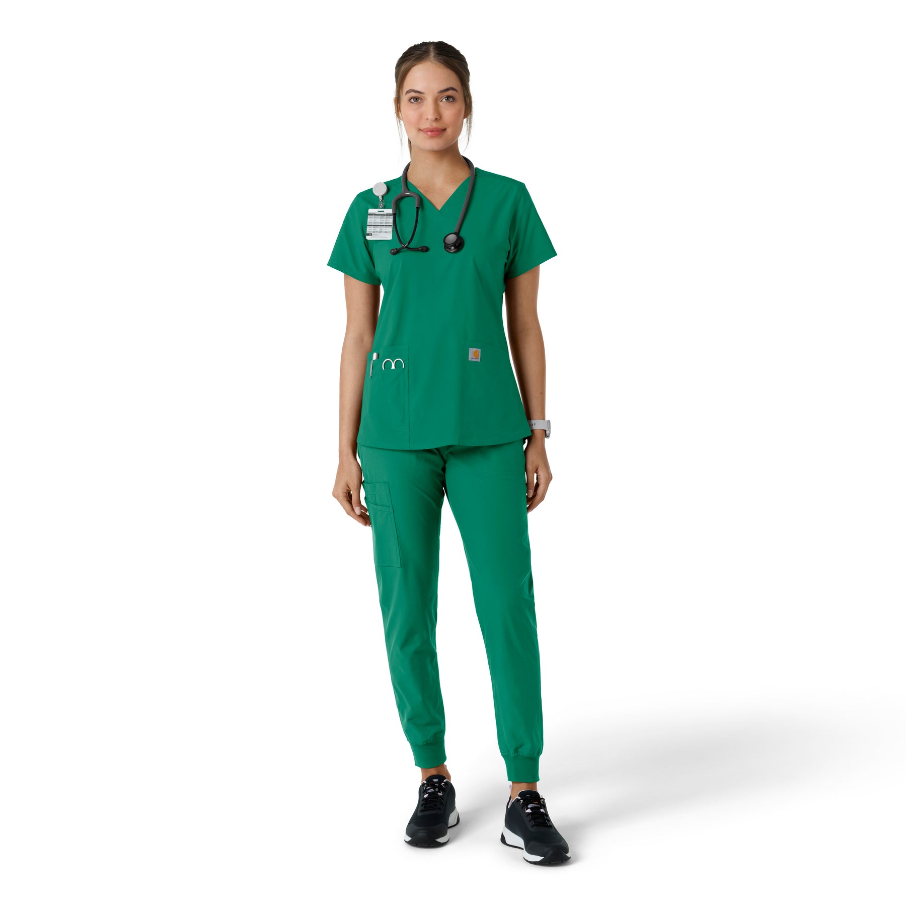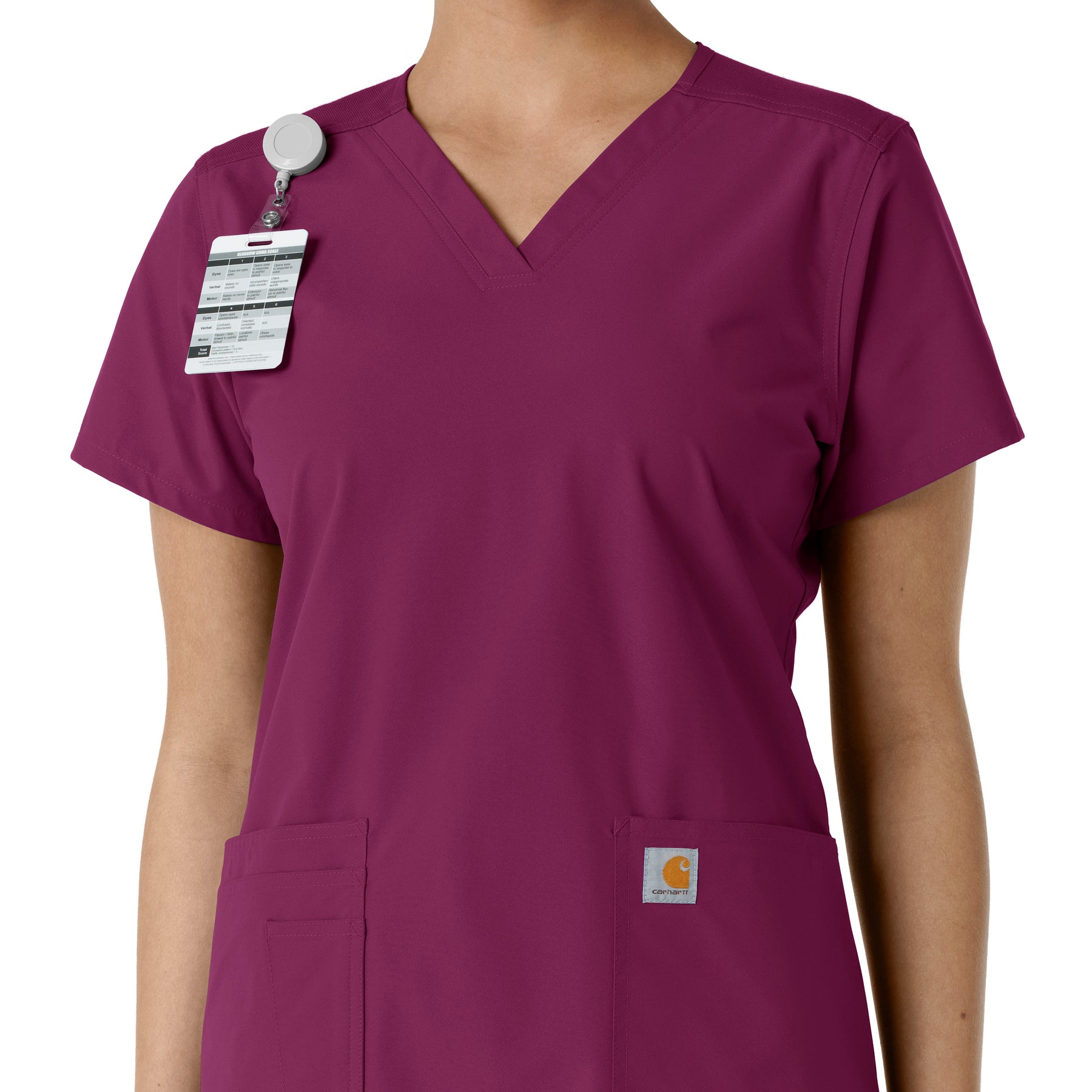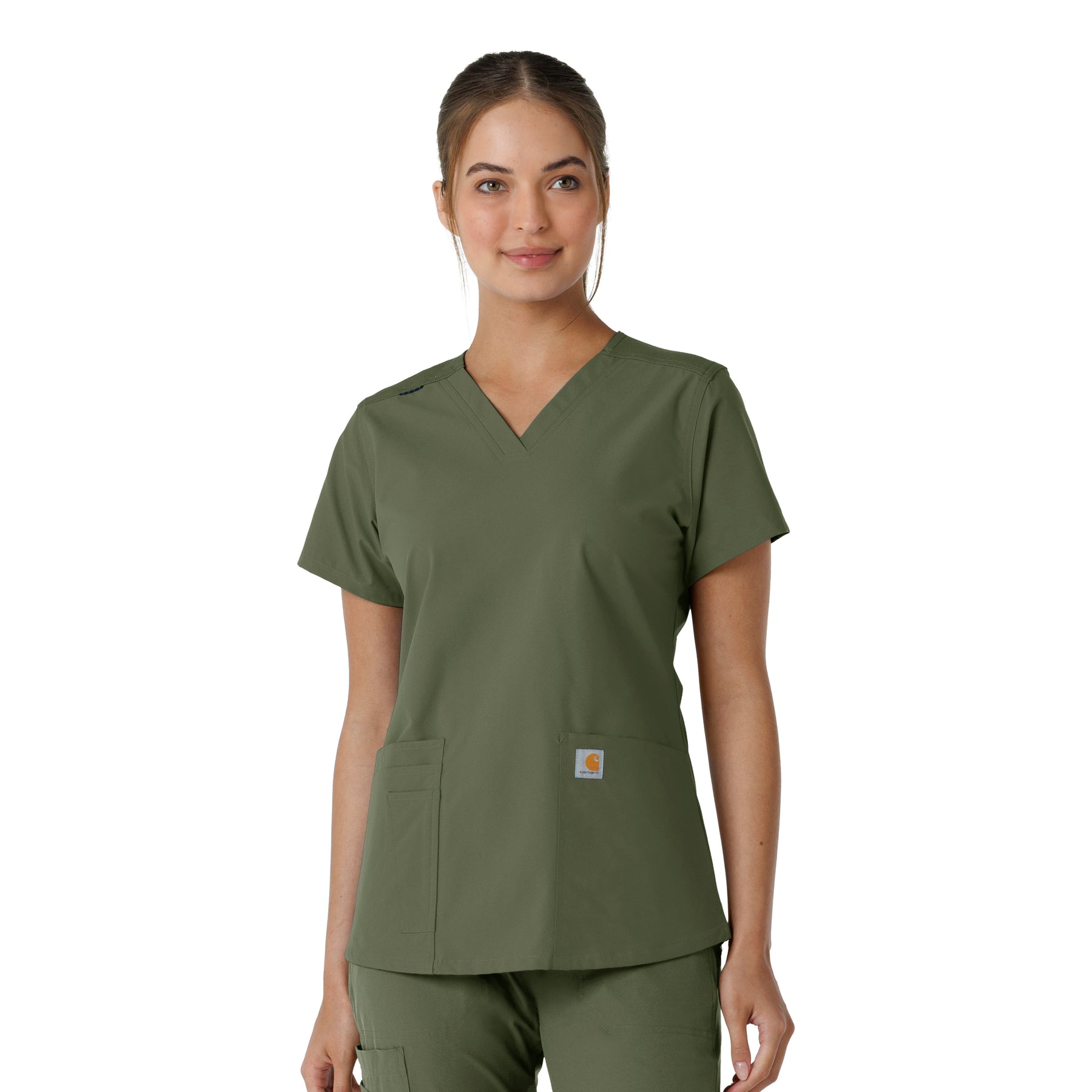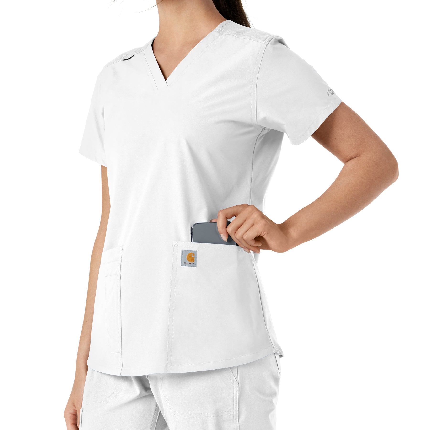 Stay comfortable and move freely with the Carhartt Force Essentials Women's V-neck Scrub Top. Featuring a back yoke knit panel, this top offers flexibility and a tailored fit with a 3/4" V-neckline and curved hem. FastDry® tech wicks away sweat, and Stain Breaker® makes stain removal easy. With two roomy front pockets, an ID badge loop, and dedicated cell phone and scissor pockets, it's built for utility and comfort.