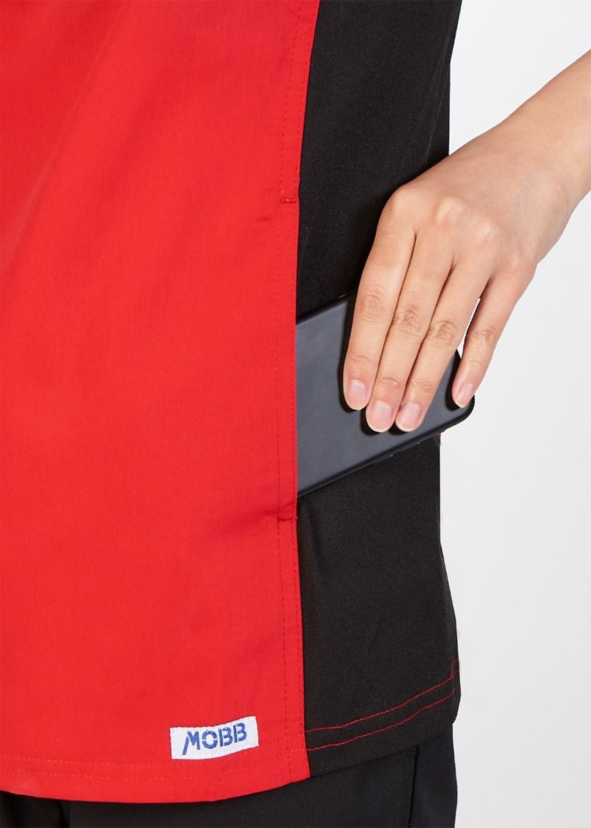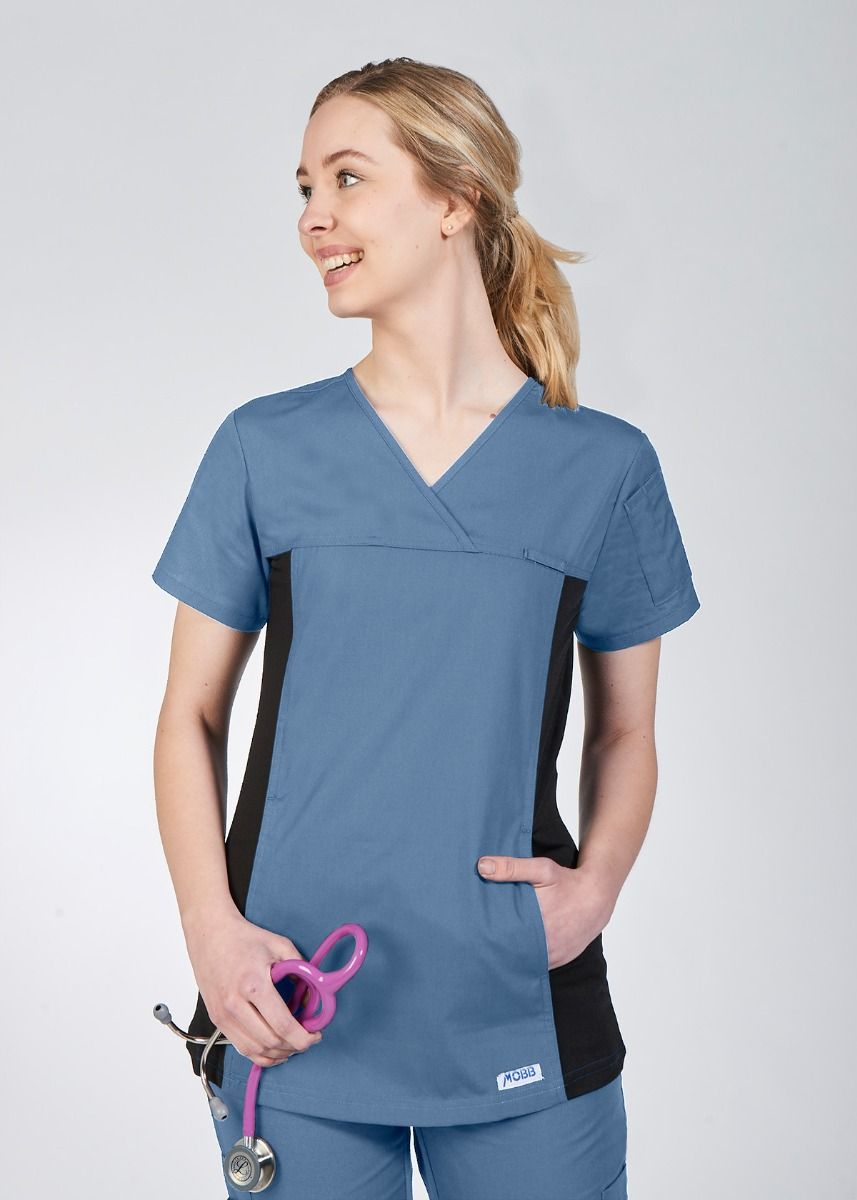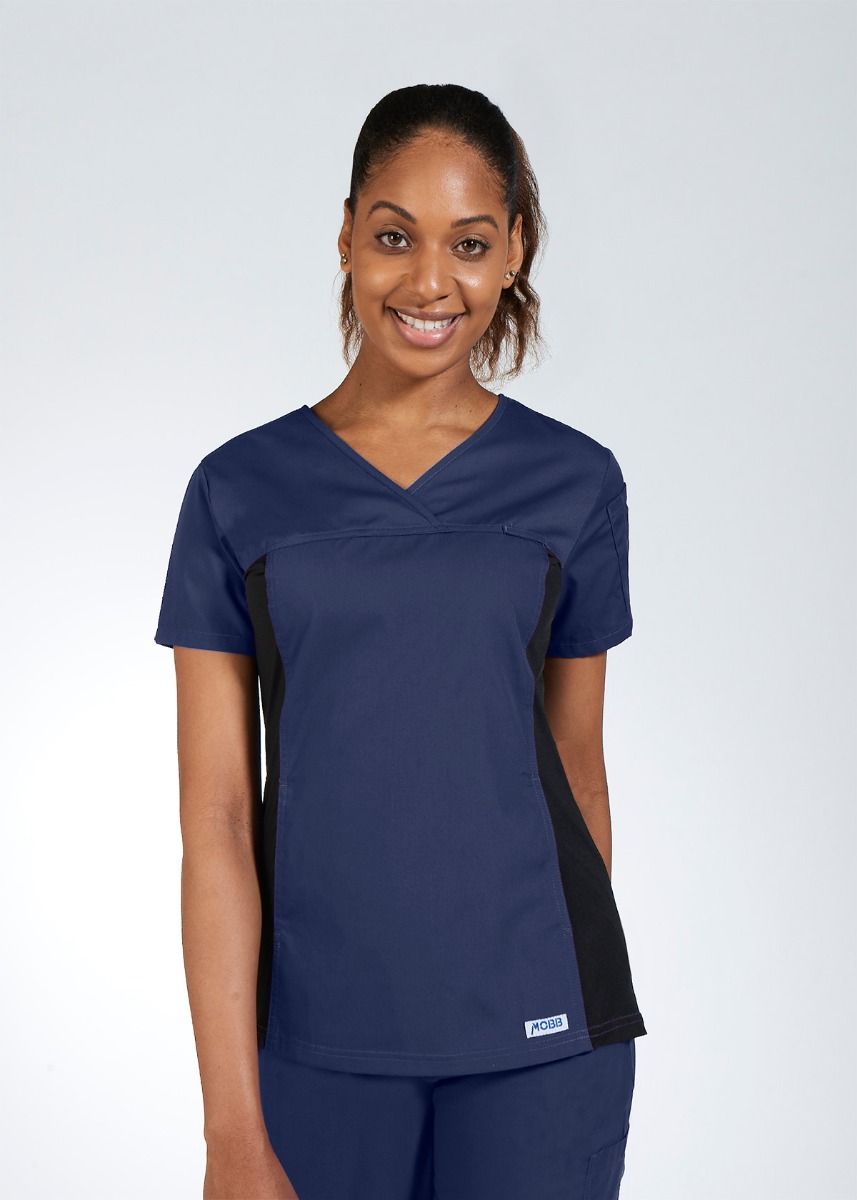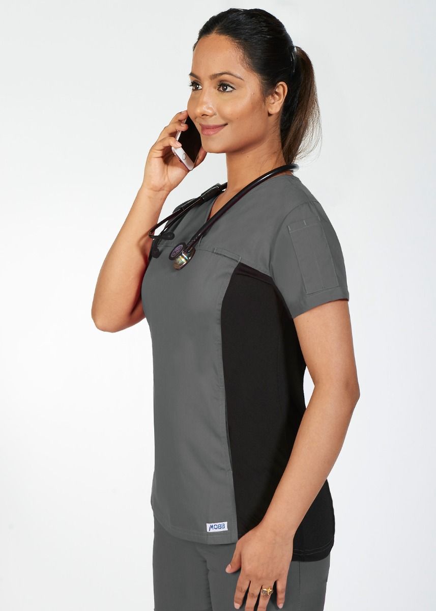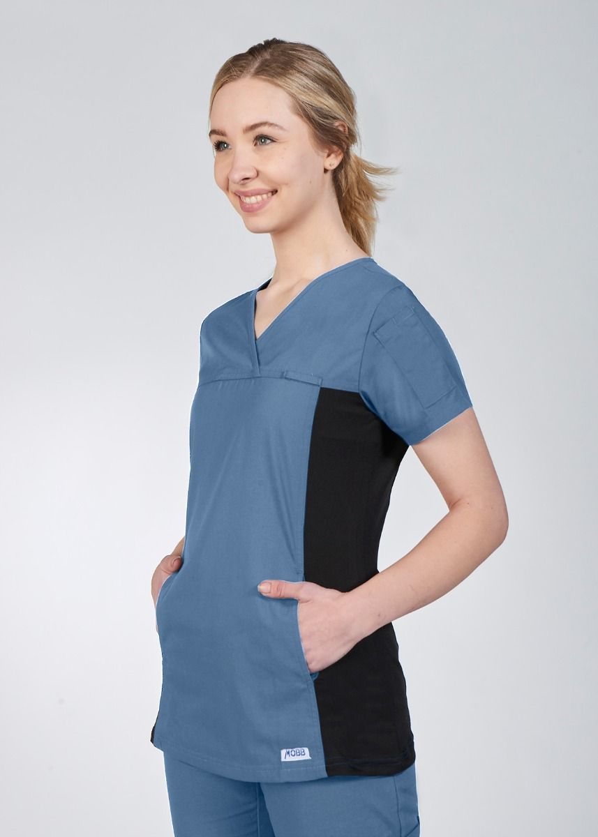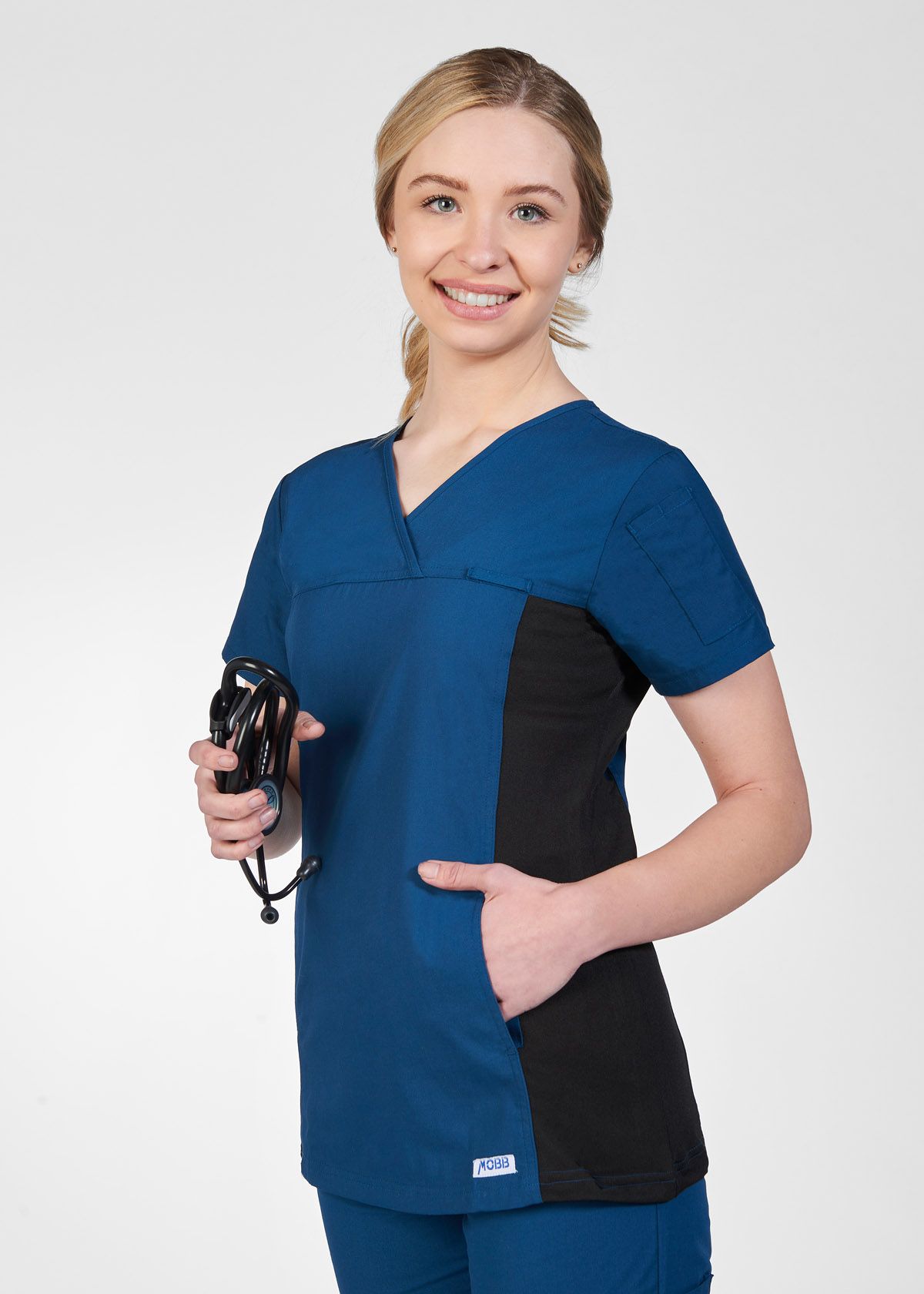 The original MOBB Flexi features our classic v-neck collar and stretch side panels. This top has two lower hidden pockets and one shoulder pen pocket. This top is available in both prints and solids.