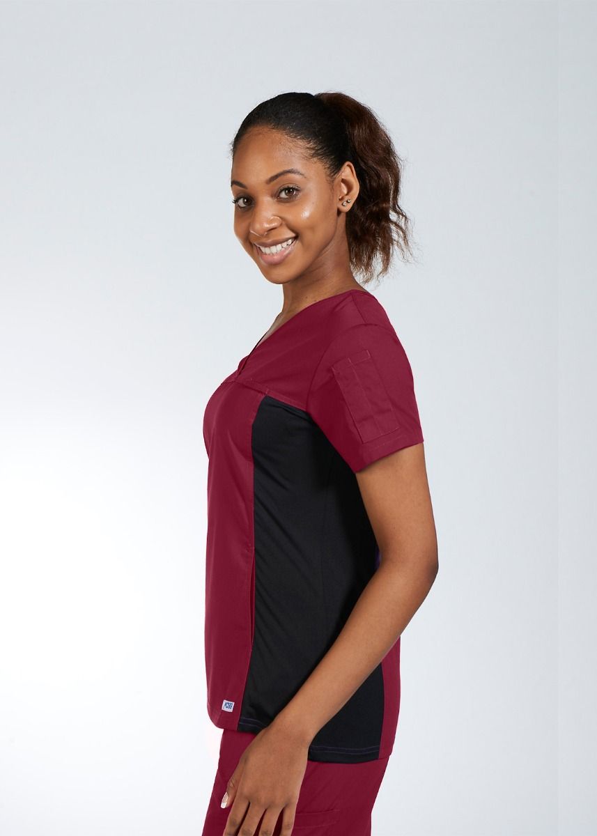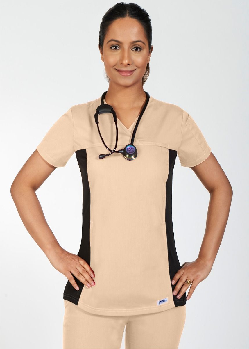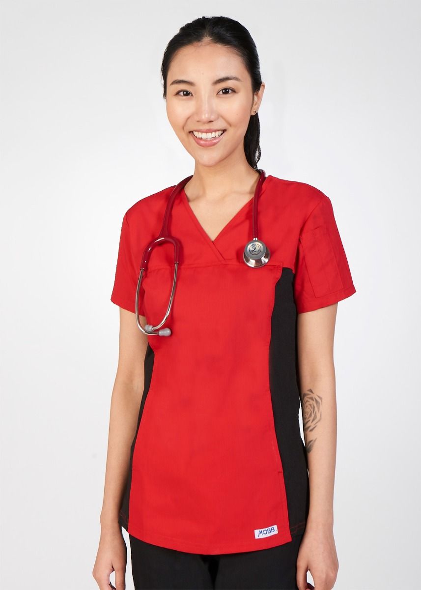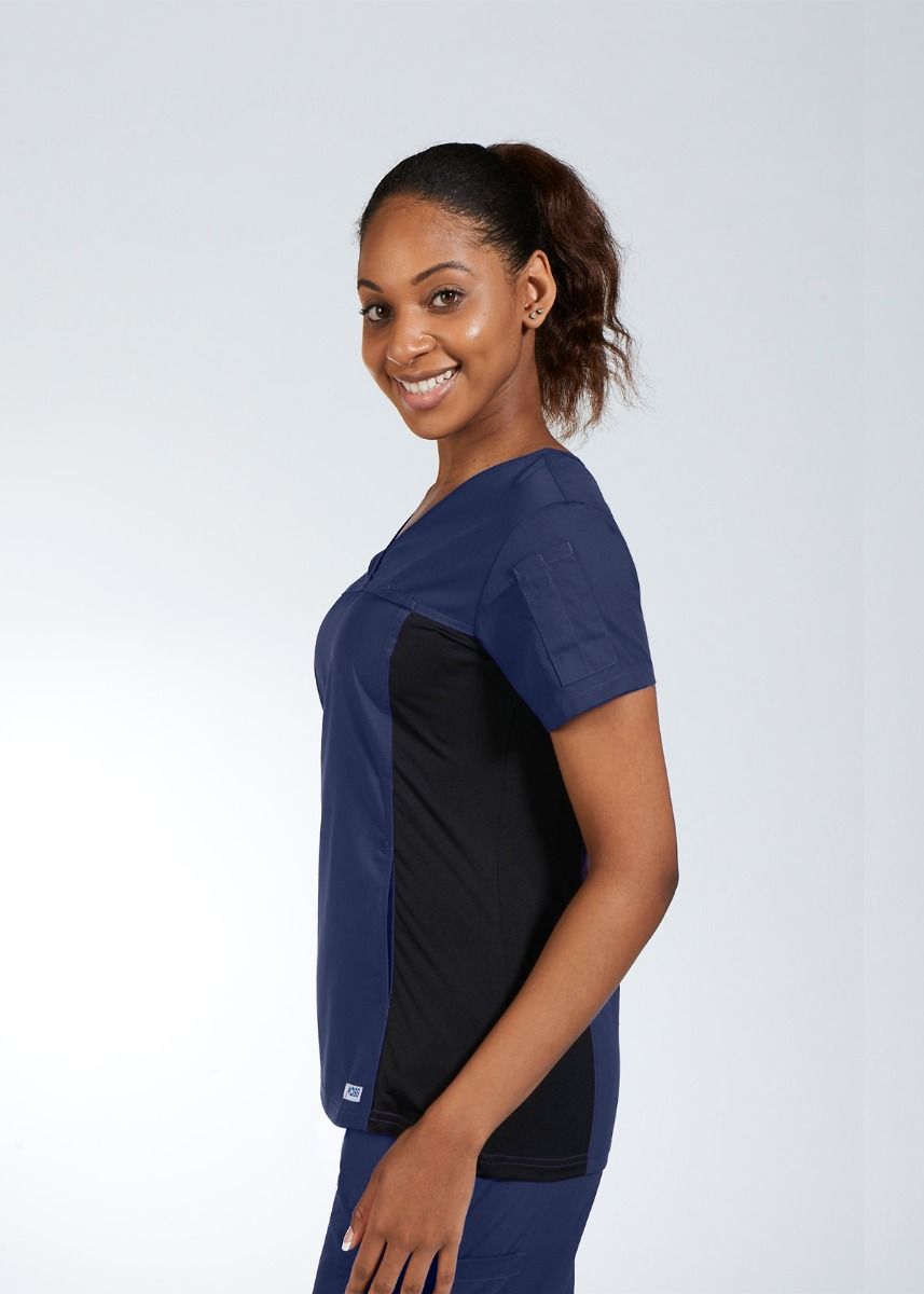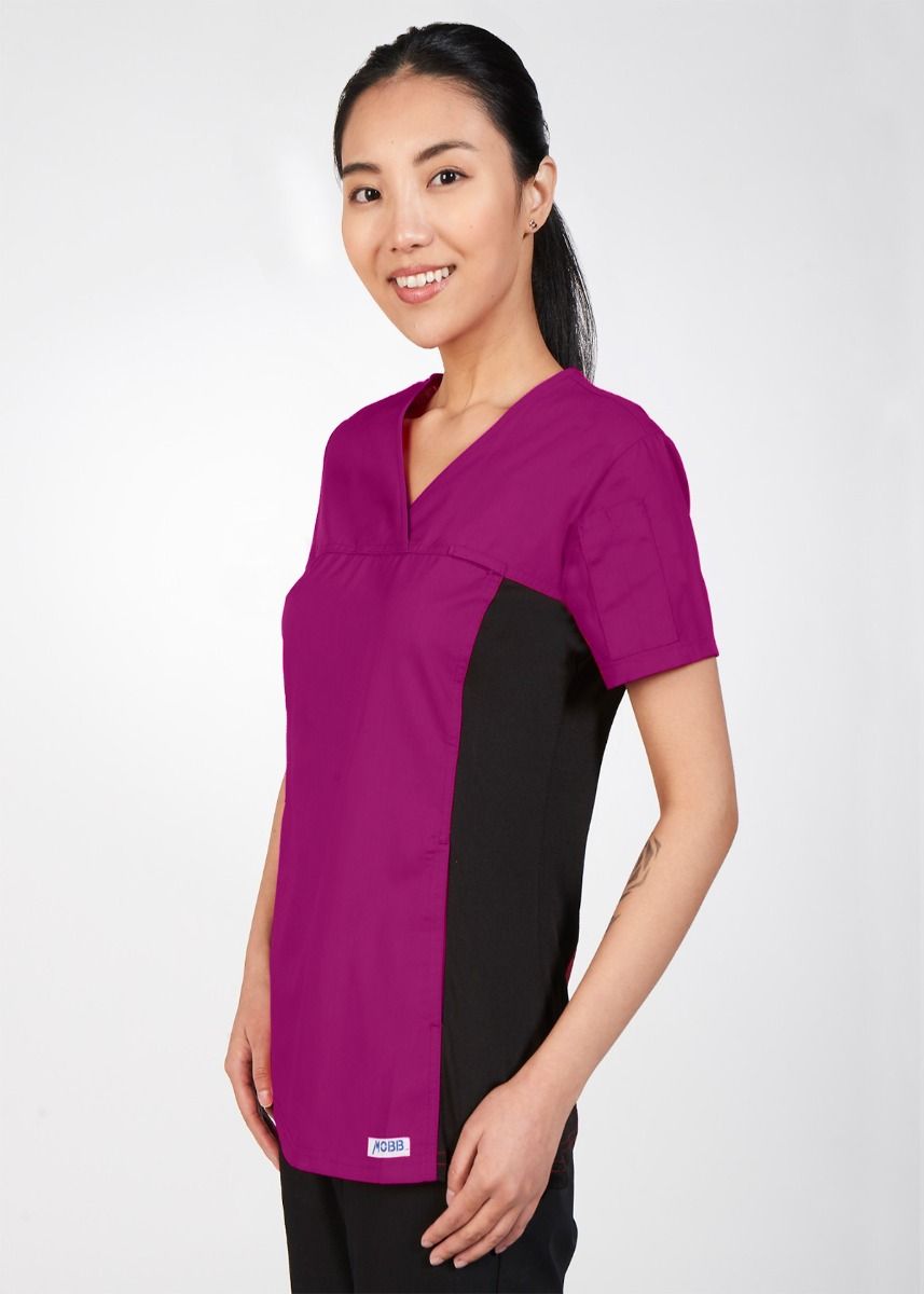 The original MOBB Flexi features our classic v-neck collar and stretch side panels. This top has two lower hidden pockets and one shoulder pen pocket. This top is available in both prints and solids.