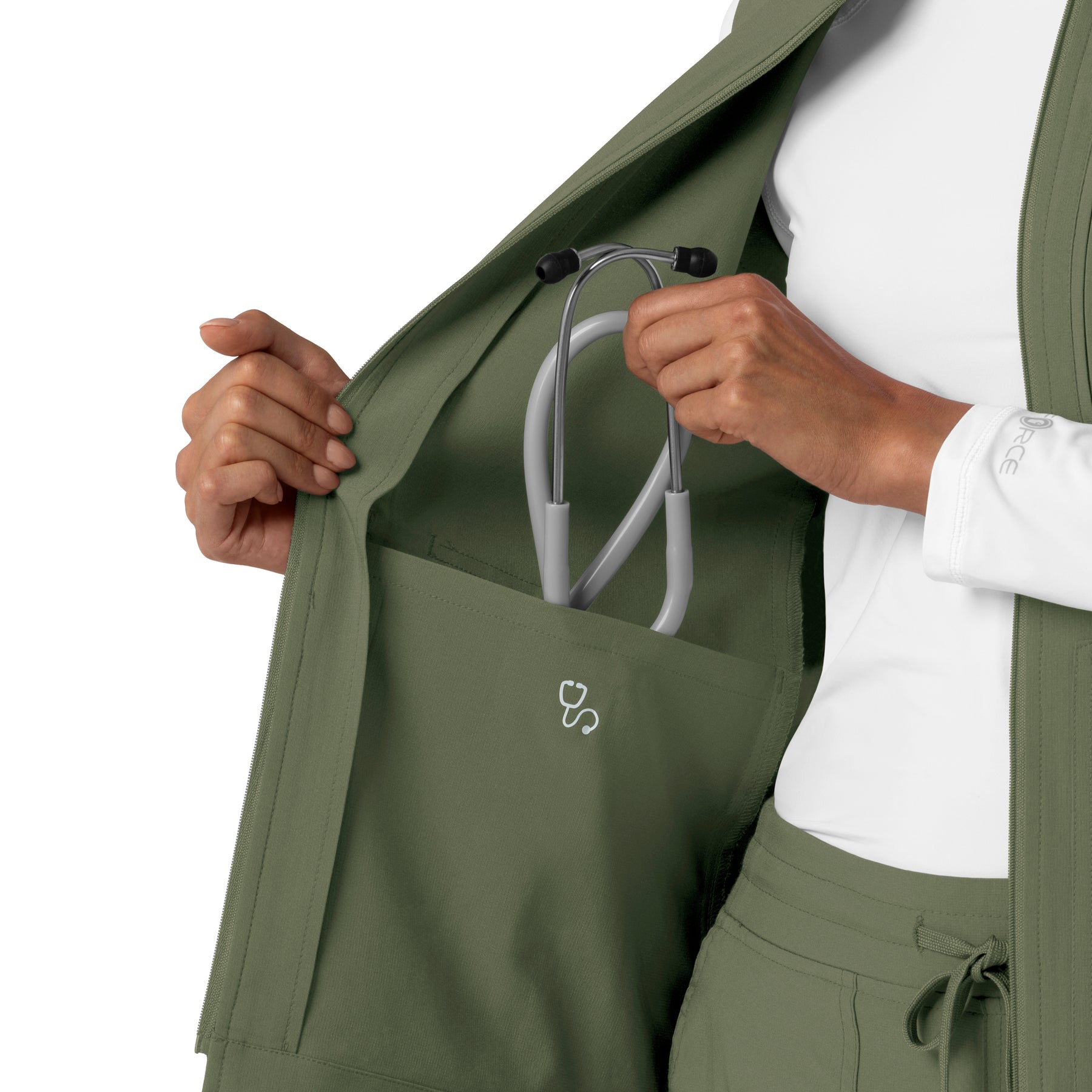 • Feature 2: One secure zip pocket, one top loading chest pocket with pen slot, two hand pockets with one pen slot, one internal stethoscope pocket