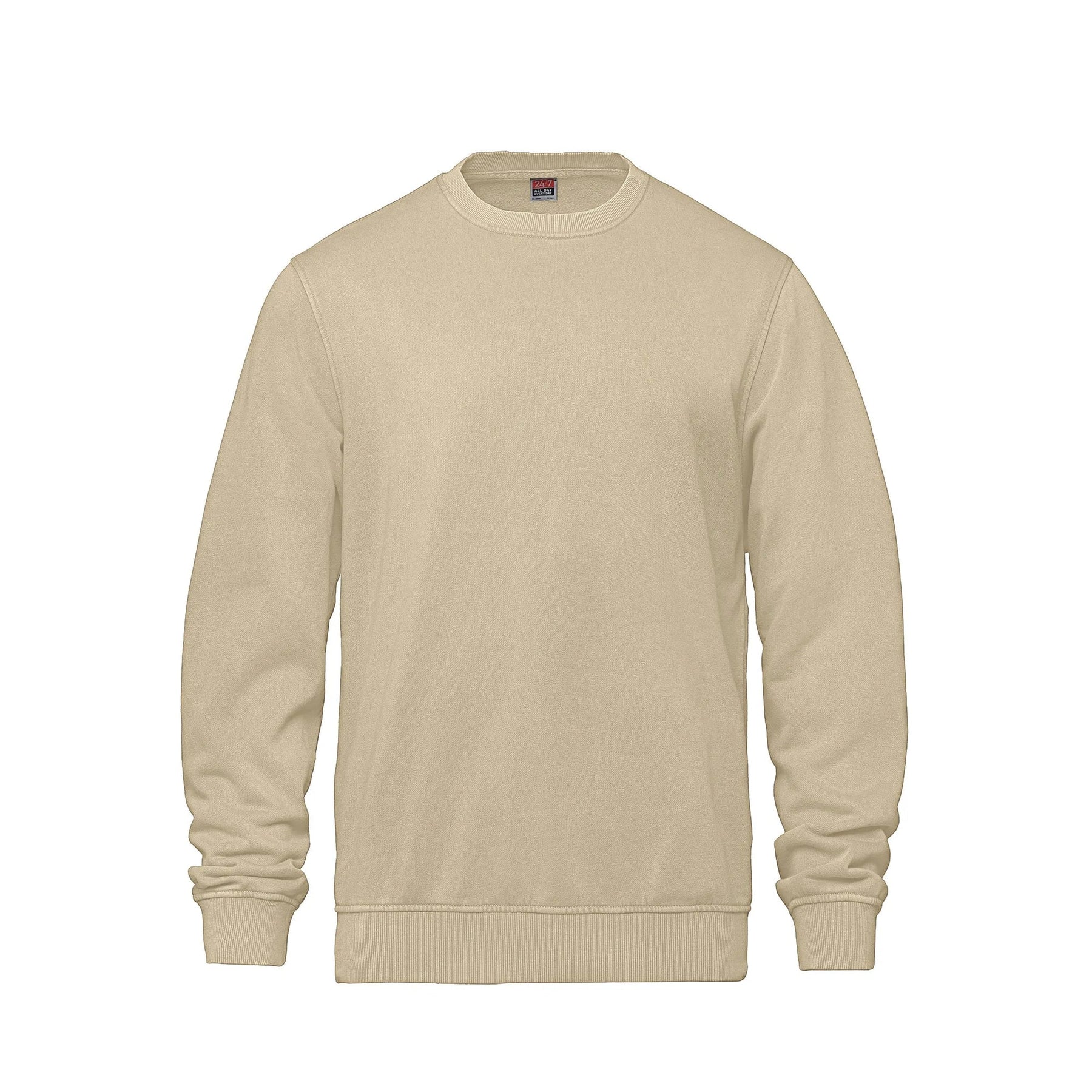 280 gsm - 8.3 oz./yd² – 14 oz./lin. yd Garment dyed 70% cotton, 30% polyester vintage wash fleece, 3 ply fleece, 100% cotton face for superior print surface. Rib knit neckline, cuff and hem with spandex. Tear away label. Shade variations are inherent with the garment dye process. Surcharges apply to 2XL-4XL.