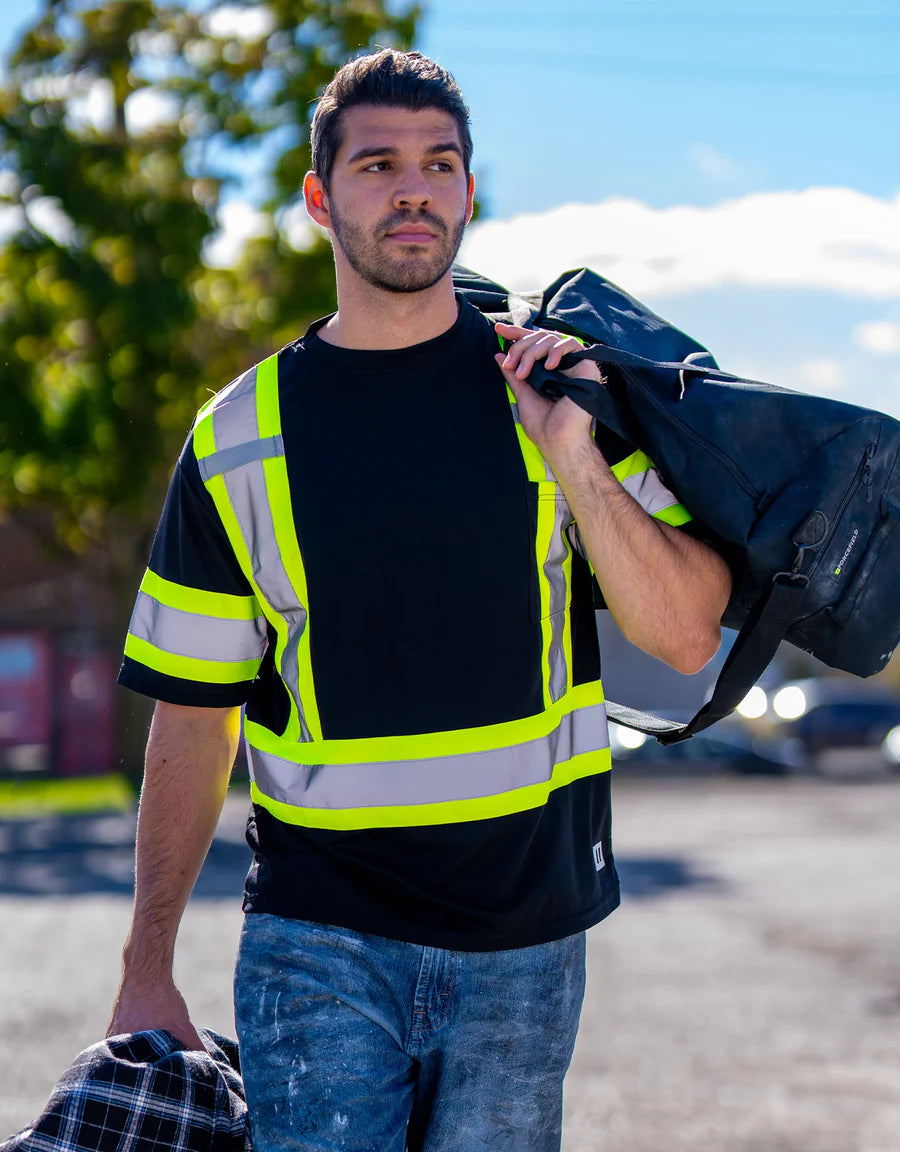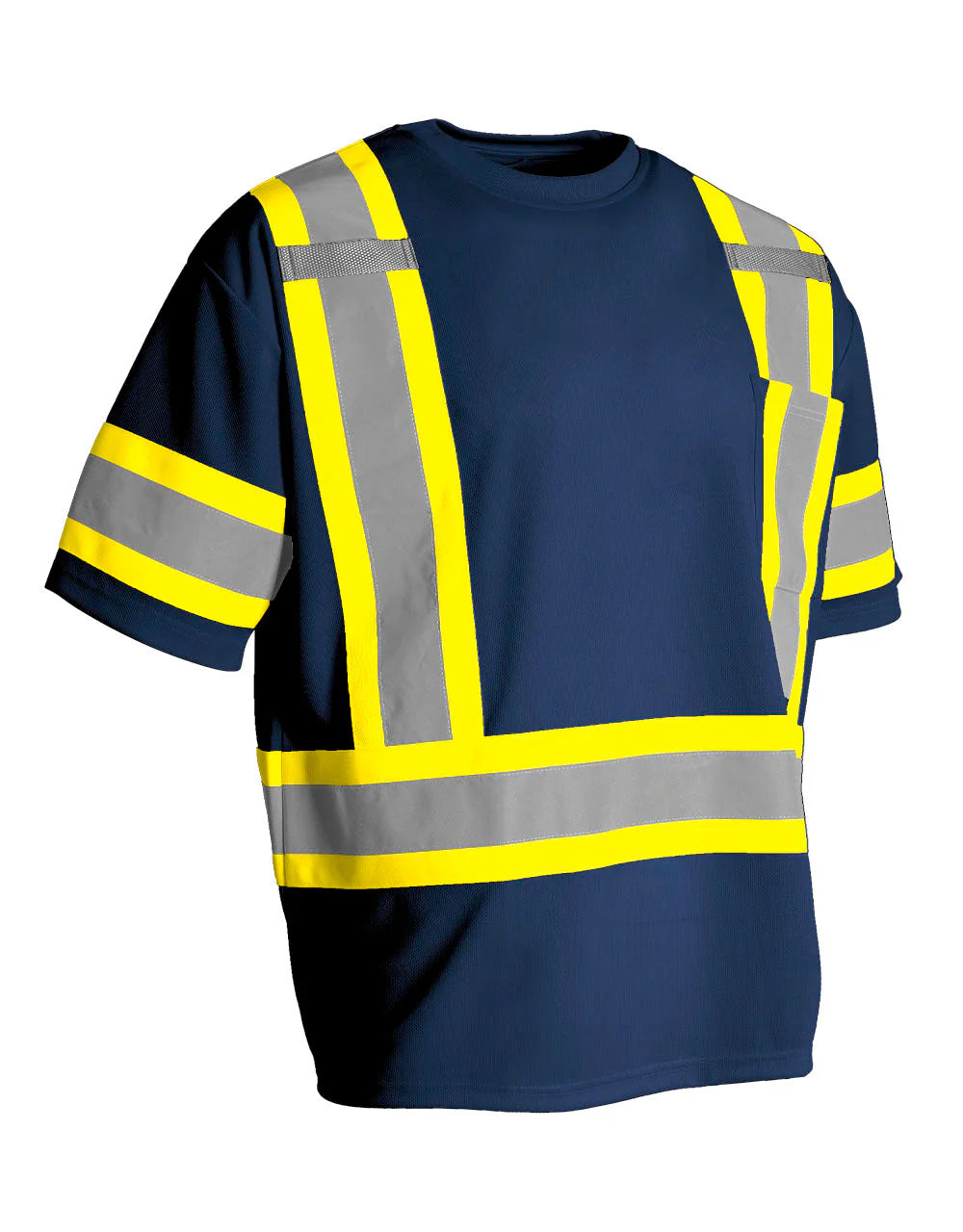 This Hi Vis Safety Tee features retroreflective 4" armbands, a crew neck, short sleeves, and a chest pocket with 2 radio clips. Made from moisture-wicking 100% polyester birdseye knit fabric, it's designed for comfort and visibility, with retroreflective silver tape in a contrasting fluorescent configuration.